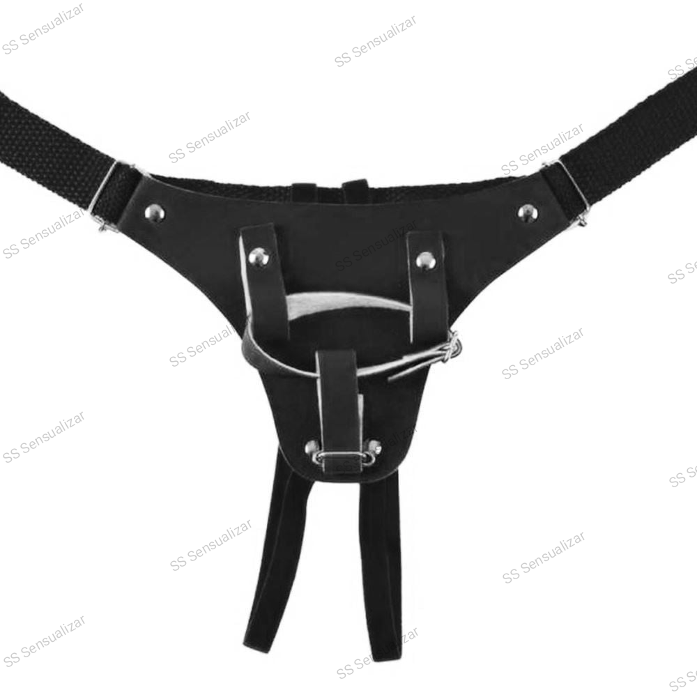 Regulagem lateral, não tem furo, usar com prótese que tenha escroto. Ótima fixação. Material 85%couro sintético,15% manta poliéster, reguladores metal.